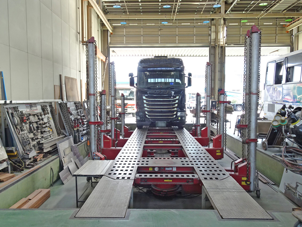 本社・セイトー工場は、最大36台を収容可能な整備工場棟と検査場棟を備え、東海地区トップクラスの規模を誇ります。広々としたクリーンな室内スペースは、車両を丁寧に整備するための理想的な環境。さらに、大型フレーム修正機やアストロループなどの最新設備を導入し、コンピューター管理による車検・点検システムで、精度とスピードを兼ね備えた整備を実現しています。